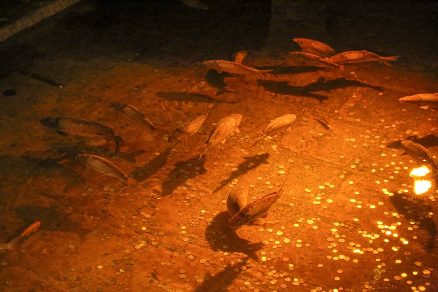 The shallow pools of water that remain today serve no practical purpose—they just look cool! Coins glint beneath the surface, thrown by visitors making wishes, while carp swim lazily through the reflections.
