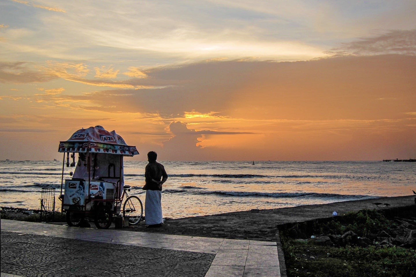 In the evening, local families, vendors, and travelers all gather along the shoreline. Street stalls sell snacks, fresh seafood, coconut water, and local treats.