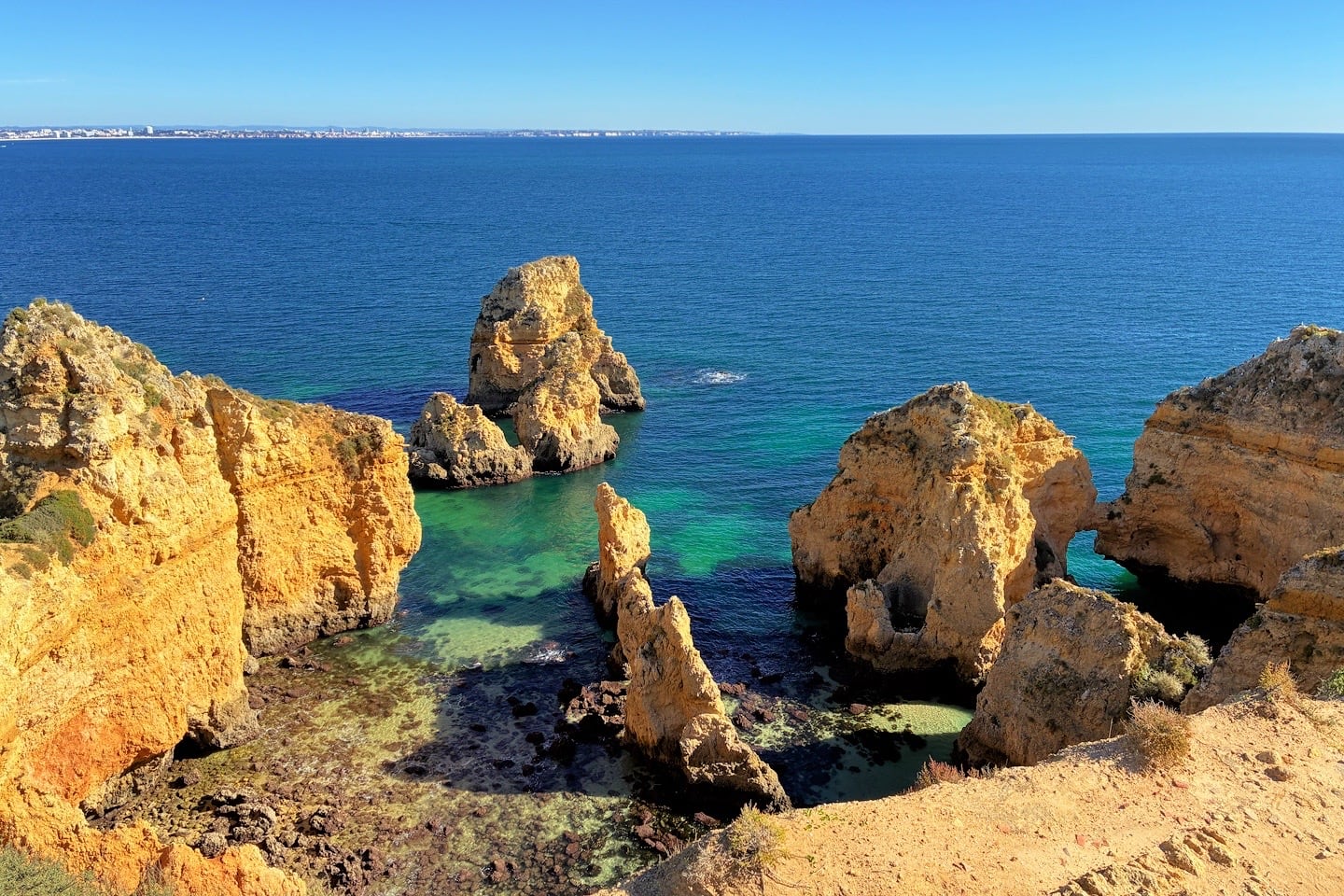 Just a few kilometers south of Old Town and flanked on both sides by the best beaches in Lagos, Ponta da Piedade’s dramatic headland is a prime example of everything that makes the western Algarve so wonderfully memorable—towering golden cliffs, sculpted arches, sea-carved caves, and water that shifts between turquoise and a deep sapphire depending on the light.